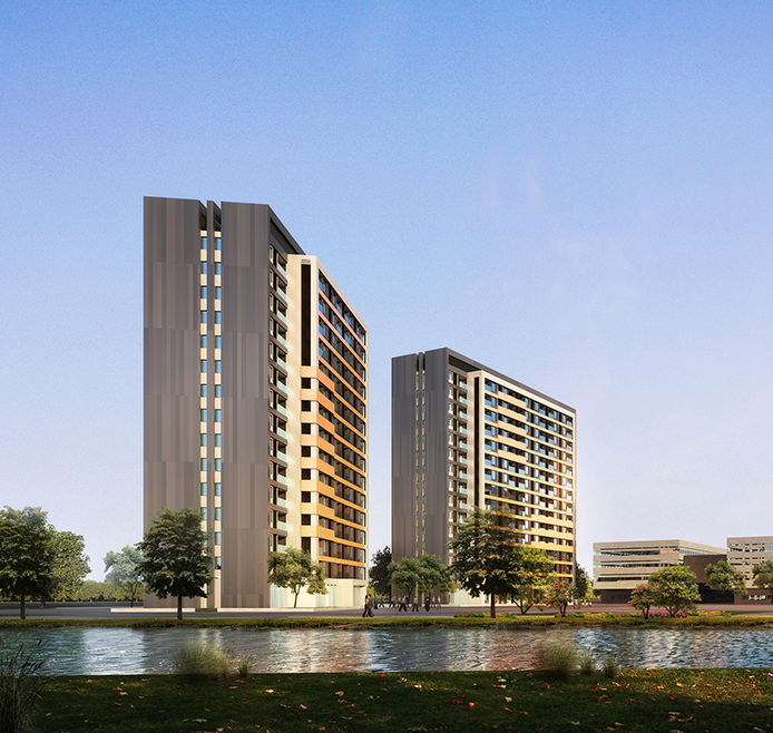 项目在空间布局上:“围而不合”“通透互融”——强调建筑与基地环境的和谐,采用半围合式的空间布局,使建筑群在平面和空间上通透互融,与环境协调对话。